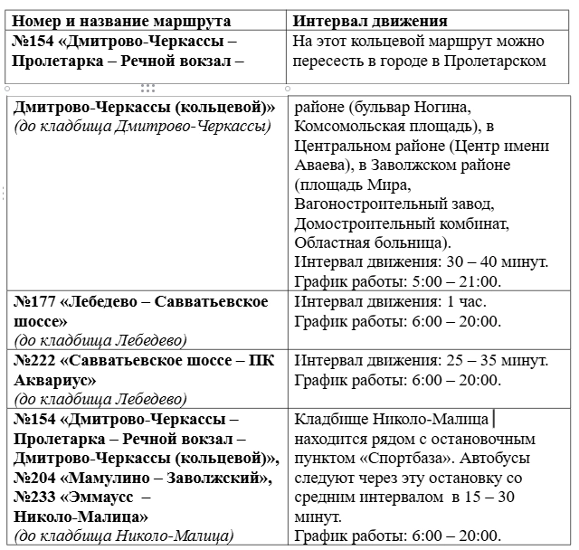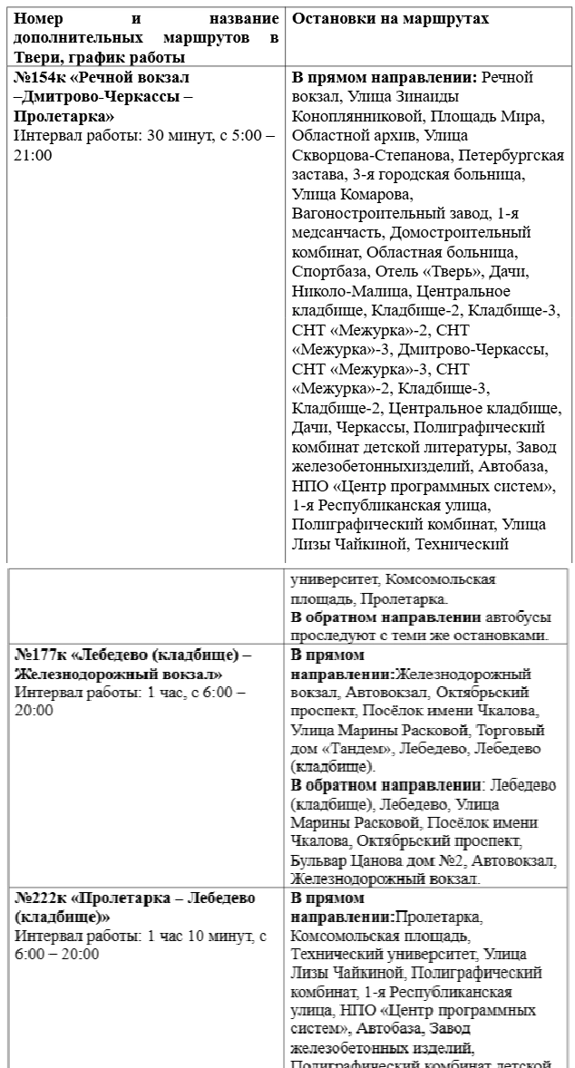 Кроме того, для удобства пассажиров предлагается использовать маршруты №154, №177, №204, №222 и №233, курсирующие в направлении кладбищ Твери.
