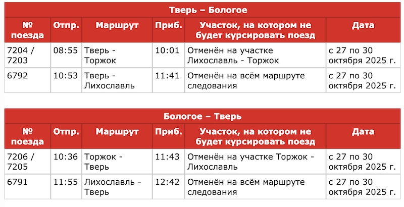 - Пригородные поезда № 6792 и 6791 на участке Тверь — Лихославль — Тверь отменяются полностью.