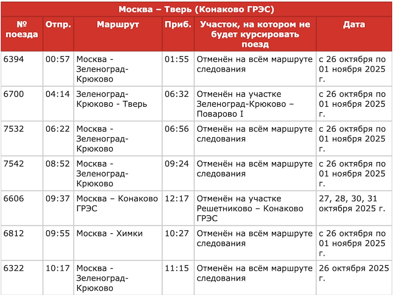 - На участке Москва — Тверь — Москва отменяется часть пригородных поездов, часть из них будет следовать укороченным маршрутом, а часть — по изменённому расписанию.