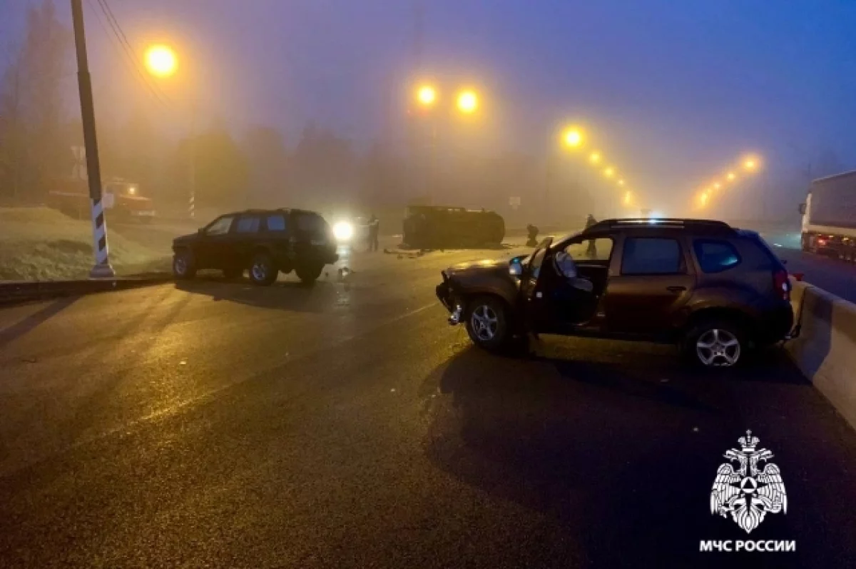 Авария произошла в Калининском округе на 158-м километре автодороги. На трассе столкнулись три машины, одна из них завалилась на бок.