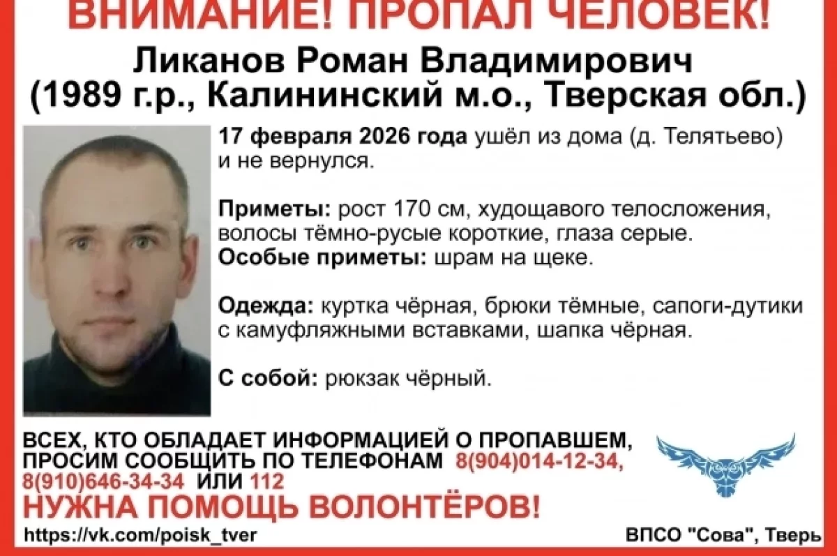 В Калининском округе Тверской области 17 февраля пропал 36-летний Роман Владимирович Ликанов. Об этом сообщили волонтёры ВПСО «Сова».