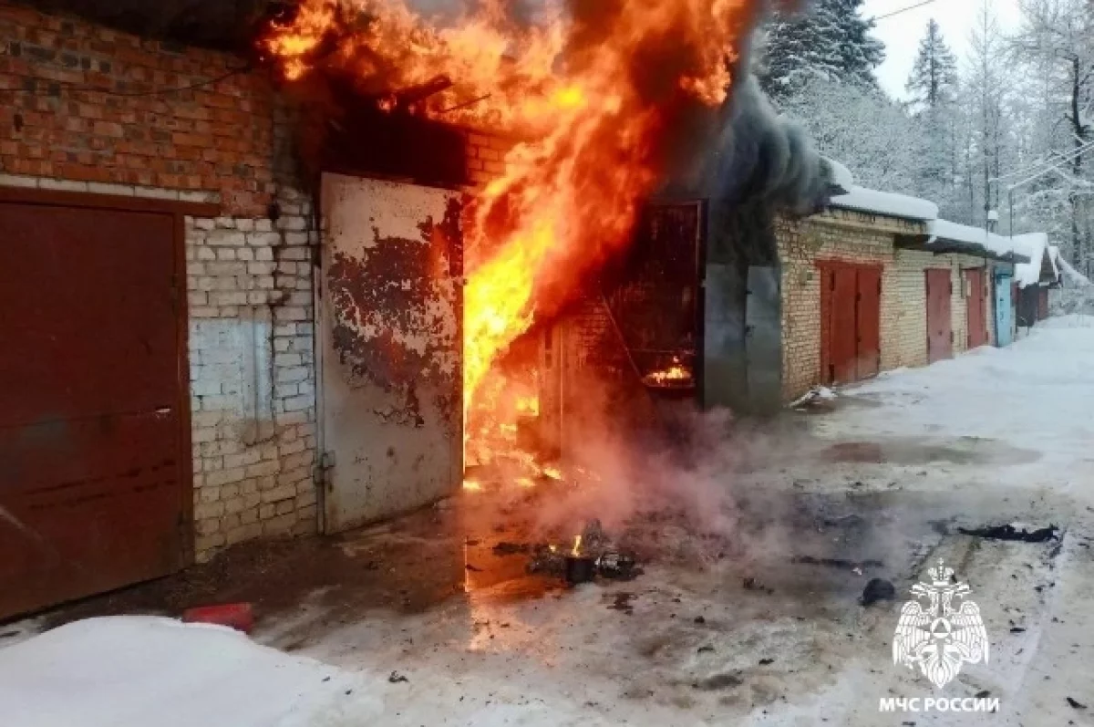 Пожар произошёл в посёлке Пригородный. Огонь полностью уничтожил находившиеся внутри строения мотоцикл и автомобиль, а также внутреннюю отделку. Кроме того, повреждения получил и соседний гараж. При пожаре никто не пострадал, его причину и причиненный ущерб установят эксперты.