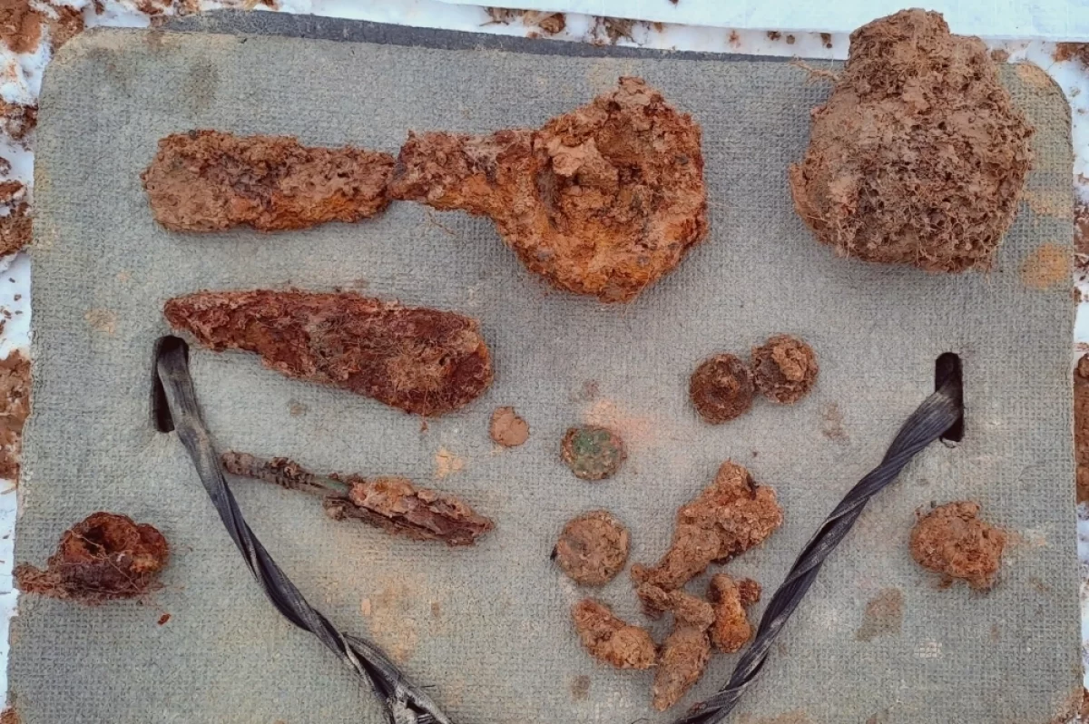 В ходе проведения раскопок вместе с останками обнаружен боевой комплект штурмовика, включающий ремнабор, масленку к винтовке Мосина и самодельную металлическую ложку.