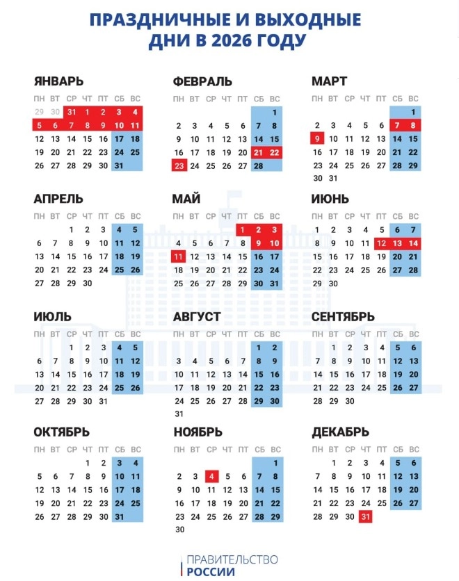 Согласно документу в следующем году будет шесть длительных выходных. Продолжительность новогодних праздничных дней составит 12 дней, с 31 декабря 2025 года по 11 января 2026 года. В 2026 году 3 и 4 января приходится на субботу и воскресенье, что являются нерабочими праздничными днями. В связи с этим было принято решение о их переносе на пятницу, 9 января, и четверг, 31 декабря соответственно.
