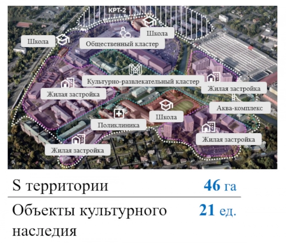 Проект предусматривает комплексное развитие территории площадью 46 гектаров. Здесь планируется построить три новые школы, четыре жилых комплекса, общественный и культурно-развлекательный кластеры, аквакомплекс и поликлинику. При этом объекты исторического наследия будут сохранены и интегрированы в новую среду.