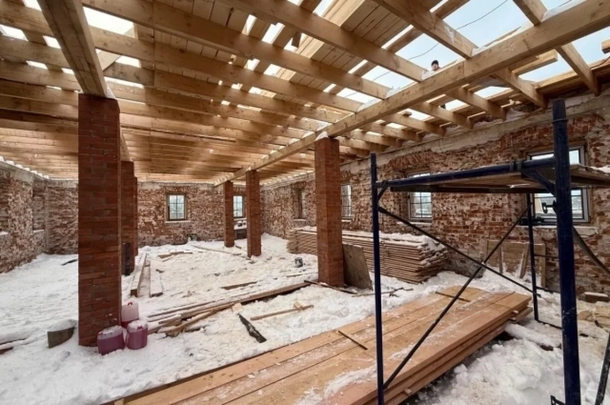 Сейчас идут работы по восстановлению крыши: старый изношенный кровельный слой снят, и рабочие приступили к установке новой стропильной системы. В ближайшее время здание будет накрыто надежной железной крышей, защищающей его от атмосферных воздействий на долгое время.