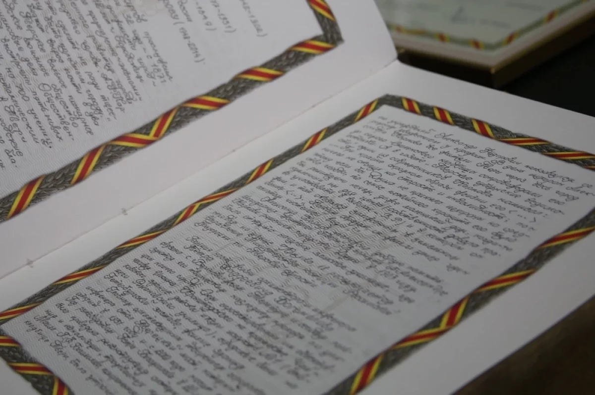Очередная торжественная церемония внесения записей в память о знаменитых людях Твери, в числе которых было и имя Петра Богомолова, состоялась в конце прошлого года. Традиционно на мероприятии инициаторам и потомкам лауреатов Золотой книги вручаются памятные свидетельства. Наталья Руф не смогла присутствовать на церемонии, в связи с чем была приглашена в Тверскую городскую Думу, где и хранится фолиант. Евгений Пичуев передал Наталье Арнольдовне свидетельство, рассказал об истории создания Золотой книги Твери и показал саму запись о Петре Богомолове.