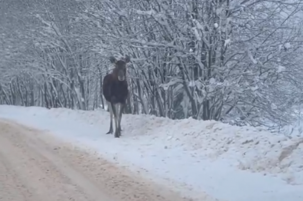 Лоси снова попали в объектив камеры на заснеженной дороге в Вышневолоцком районе Тверской области. Видео появилось в местной группе.