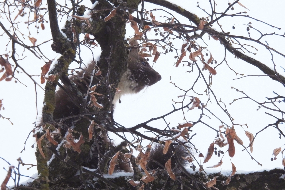 Пушистая гостья ловко передвигалась по тонким веточкам высоких деревьев, прыгая с липы на лиственницу и обратно. Она проявляла прекрасную координацию и ловкость: висела в воздухе, держась только передними лапами, и взбиралась всеми четырьмя. Для неё такие трюки были лёгкой игрой, демонстрируя бесстрашие и умение ориентироваться в кронах деревьев.