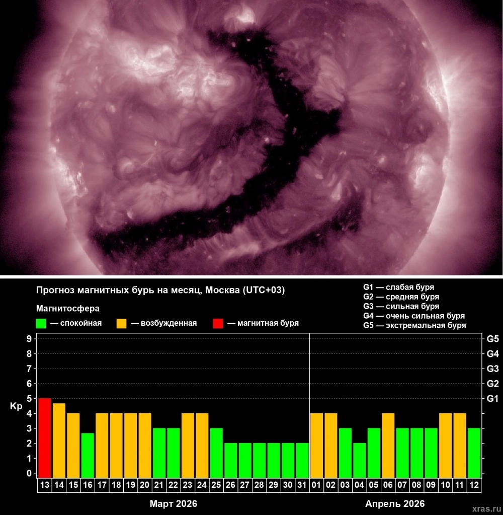Месяц назад, при прошлом обороте, это же образование вызывало бури уровня G1–G2. Специалисты не исключают повторения схожей интенсивности бурь.