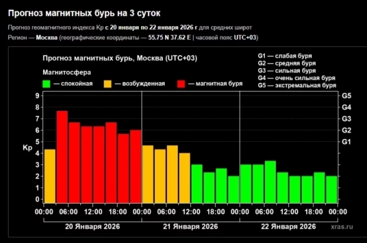 Во вторник, 20 января, на Землю была зафиксирована магнитная буря. Около 03:00 по московскому времени произошёл переход геомагнитных колебаний в сильную магнитную бурю, достигшую уровня G-3. К 06:00 сила магнитной аномалии снизилась до уровня G-2. Ожидается, что до 18:00 пик штормовой активности сохранится на уровне G-2, после чего она продолжит снижение до G-1.