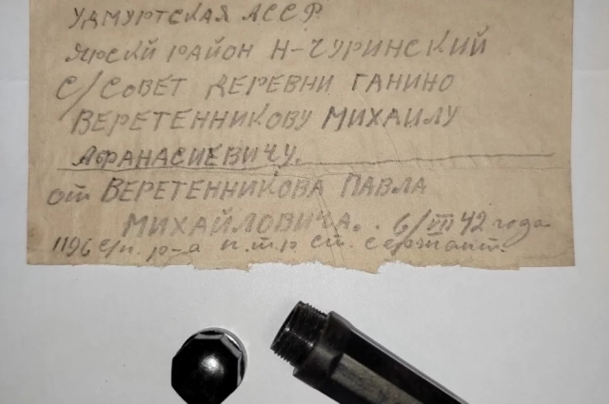 Медальон принадлежал Павлу Михайловичу Веретенникову (старший сержант роты ПТР 1196 стрелкового полка, 1910 г. р., уроженец деревни Ганино, Ярского района Удмуртской АССР). Родственники бойца пока не найдены.