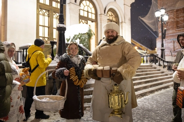Для всех молящихся было приготовлено угощение: горячий сбитень – старинный русский напиток из мёда, пряностей и трав. Всех желающих им угощал сбитенщик в традиционной одежде.