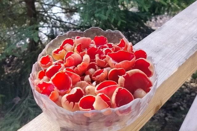 Марина сегодня собирала грибы в лесу по Старицкому шоссе и набрала целую миску саркосциф.