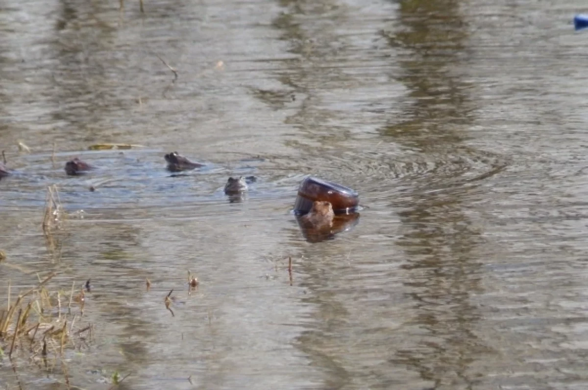 «Не очень догадливый самец, пытавшийся схватить в амплексус стеклянную бутылку. А также обычные сородичи, травяные лягушки», - написал автор видео.